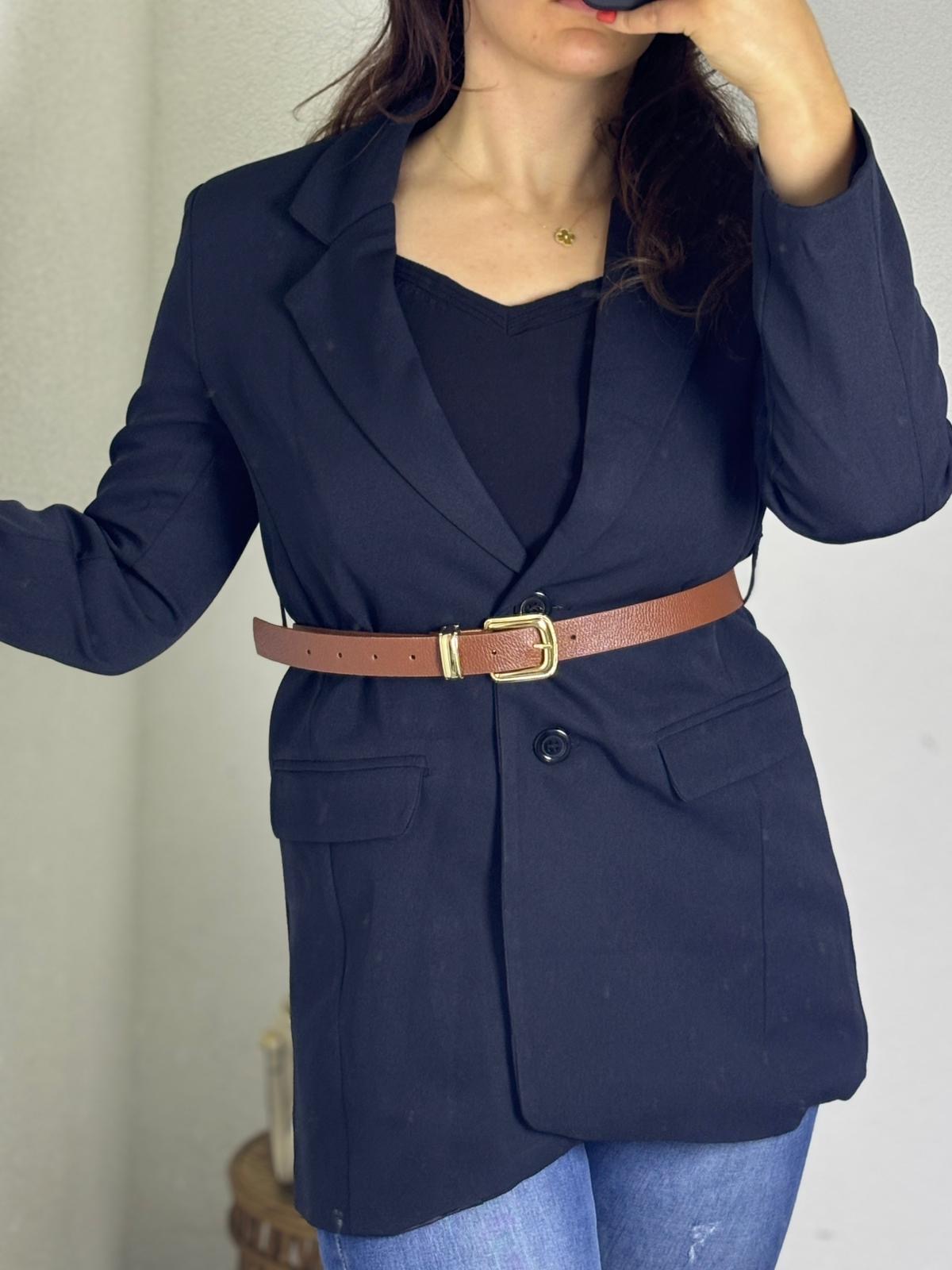 Istaknite svoj stil uz naš elegantni ženski sako sa kaišem u klasičnoj crnoj boji. Ovaj model kombinuje sofisticiran izgled i savremeni kroj koji savršeno naglašava figuru. Smeđi kaiš u struku dodaje dašak modernosti i ženstvenosti, dok kvalitetan materijal osigurava udobnost tokom cijelog dana.